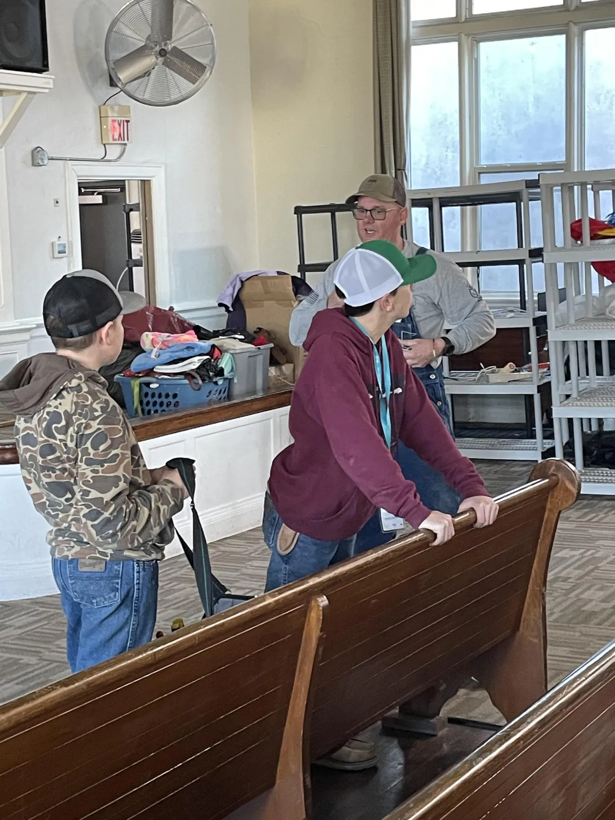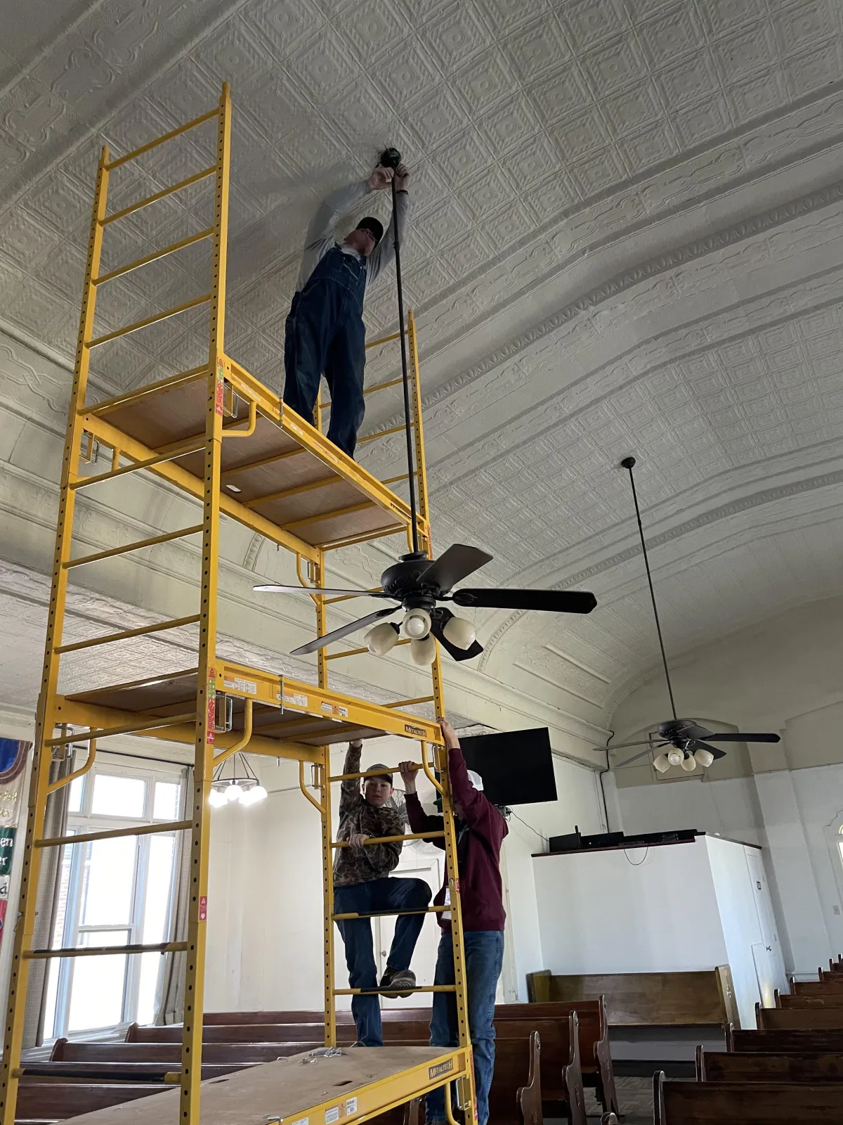 Raised ceiling fans in the sanctuary for the new sound booth